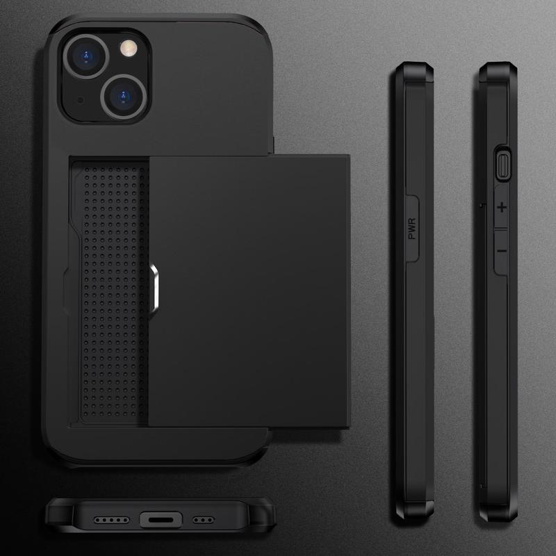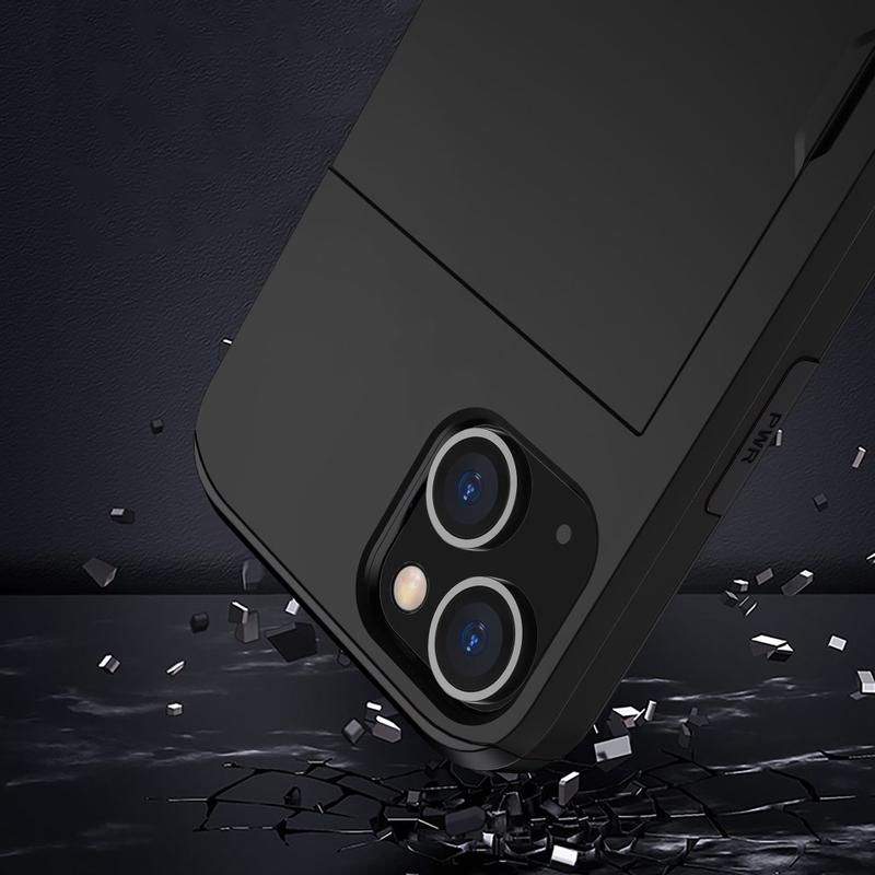 iPhone 15 Hybridní Pouzdro s Posuvným Držákem na Karty - Černé