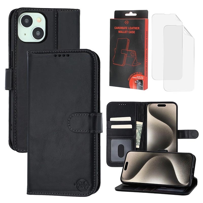 MyTPhone CardMate Premium Leather Wallet Case for iPhone 15 - Stand Feature, Card Holder, Wireless Charging Support, 2x Screen Protector