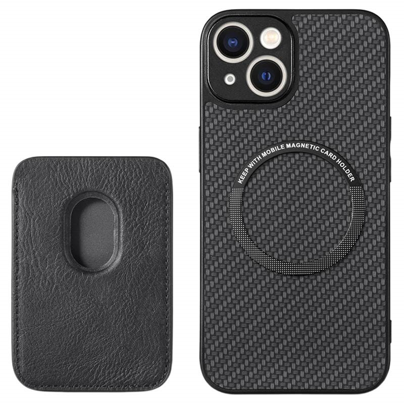 iPhone 15 Plus Magnetic Case with Card Holder - Carbon Fiber - Black