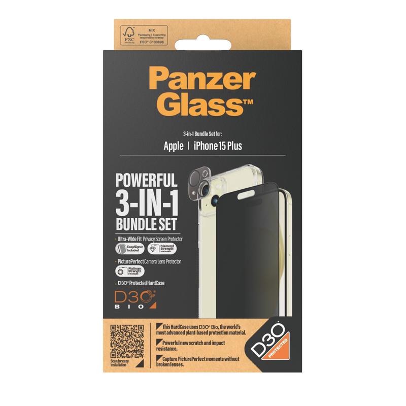 PanzerGlass Privacy 3-in-1 Pack for iPhone 15 Plus - HardCase Cover, PicturePerfect Camera Lens Protector, Ultra-Wide Fit Privacy Screen Protector
