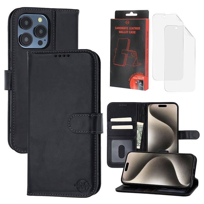 MyTPhone CardMate Premium Leather Wallet Case for iPhone 15 Pro - Stand Feature, Card Holder, Wireless Charging Support, 2x Screen Protector