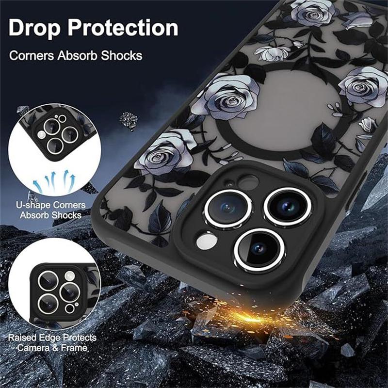 Bring timeless elegance to your iPhone with the Rose Flower Pattern MagSafe Case for iPhone 15 Pro. Combining beauty and protection, this case features a vintage-inspired rose print that adds sophistication while safeguarding your device. Crafted from a durable blend of hard PC and flexible TPU, it offers superior shock absorption and impact resistance. The built-in magnetic ring ensures full MagSafe compatibility for secure attachment and efficient wireless charging.