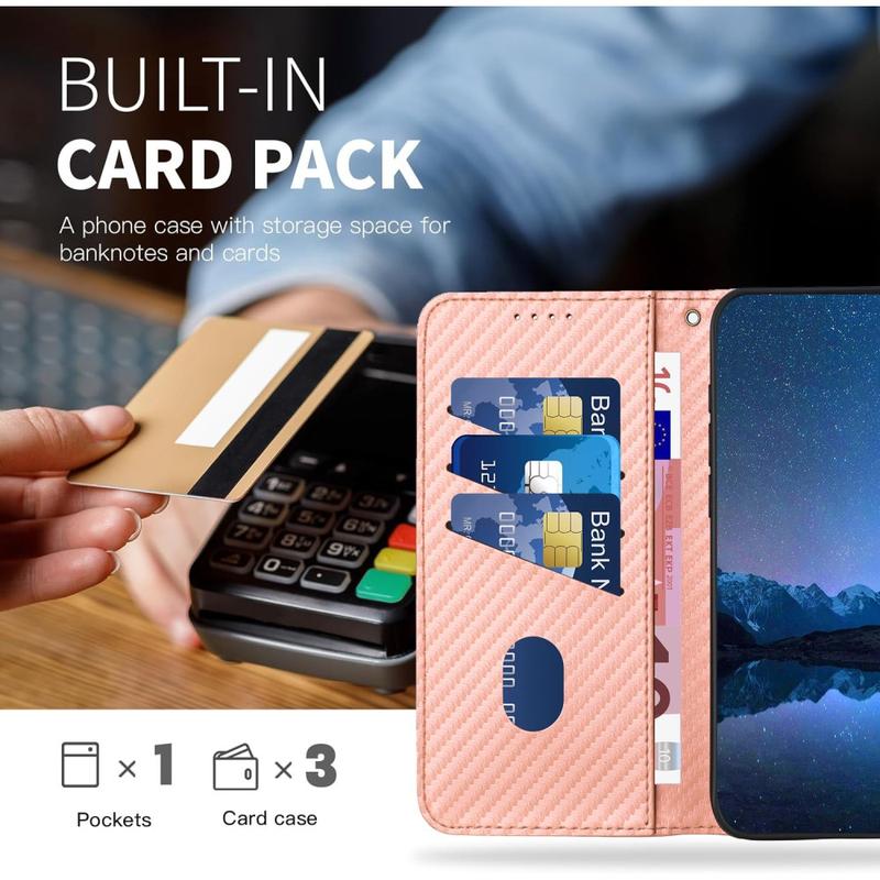 This wallet case offers elegant design, reliable protection, and smart usability. The textured carbon fiber finish adds a modern, professional look, while the inner TPU layer absorbs shocks from accidental drops. With hands-free functionality and a detachable strap, it’s built for comfort and versatility.