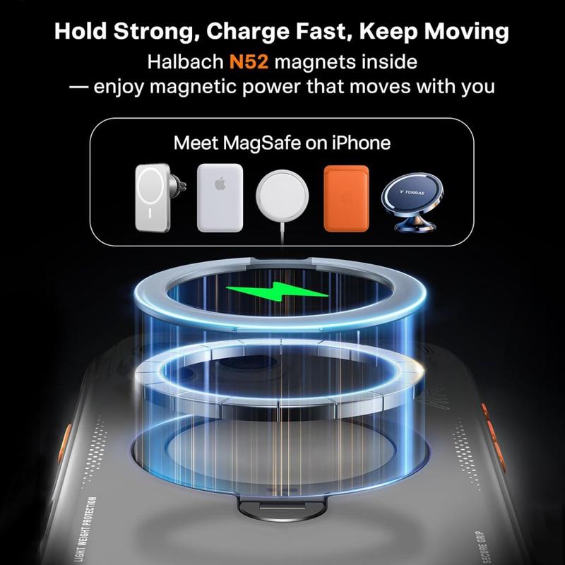 Featuring Halbach Array technology with premium N52SH neodymium magnets, the case delivers up to 200% stronger magnetic force. This ensures reliable attachment and charging with all MagSafe accessories.