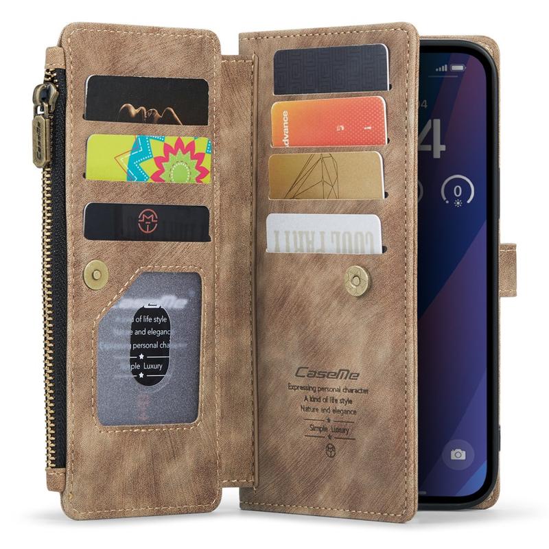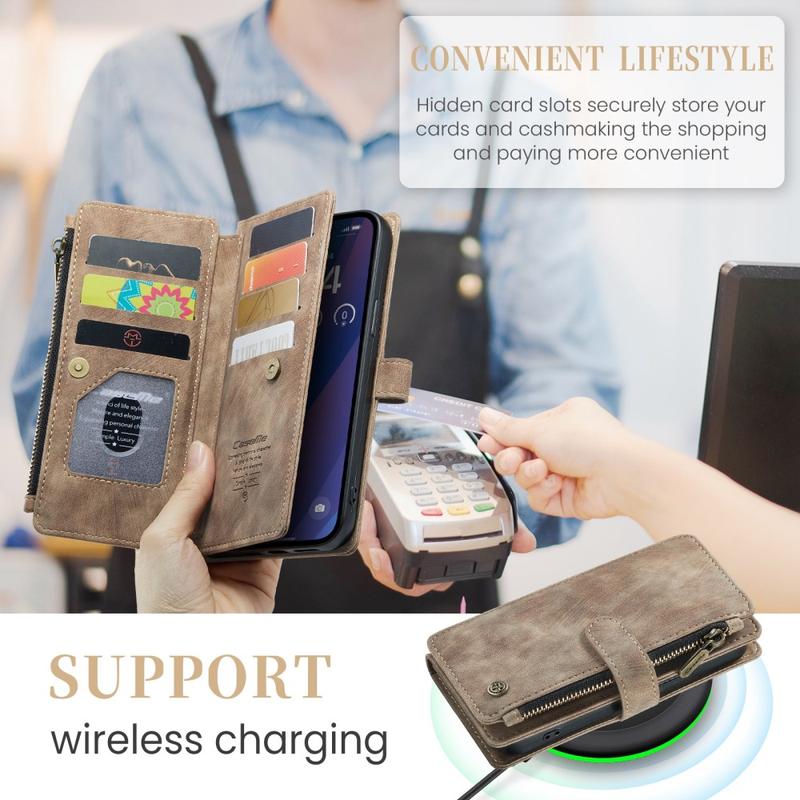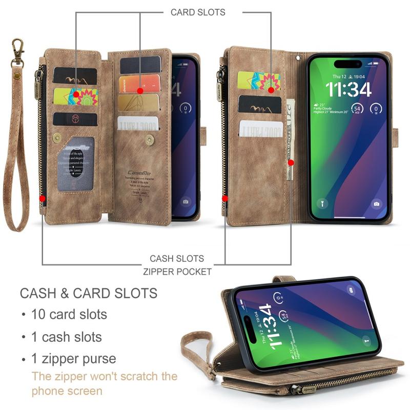 The Caseme C30 multifunctional wallet case for iPhone 16 Plus brings exceptional all-around protection and an exclusive, refined design. This elegant case is made of premium polyurethane, reinforced with a shock-resistant TPU inner cover that snuggles your iPhone 16 Plus perfectly. Meanwhile, the Caseme C30 wallet case is enhanced with numerous card slots, one large money compartment inside, and one outside zipper pocket, all protected by a secure magnetic closure.