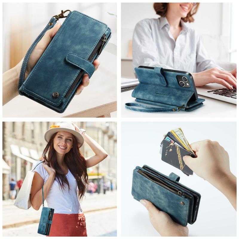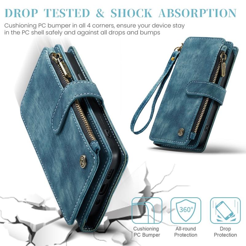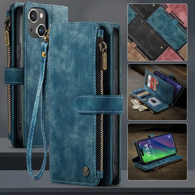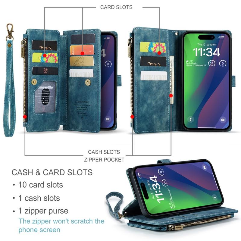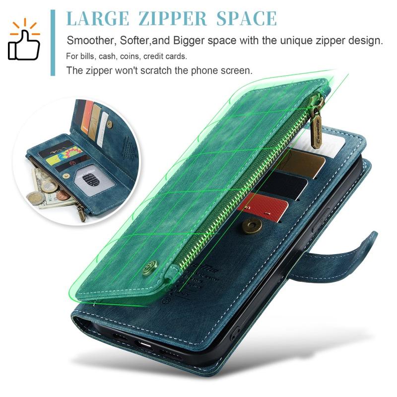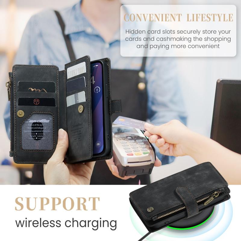 The Caseme C30 multifunctional wallet case for iPhone 16 Plus brings exceptional all-around protection and an exclusive, refined design. This elegant case is made of premium polyurethane, reinforced with a shock-resistant TPU inner cover that snuggles your iPhone 16 Plus perfectly. Meanwhile, the Caseme C30 wallet case is enhanced with numerous card slots, one large money compartment inside, and one outside zipper pocket, all protected by a secure magnetic closure.