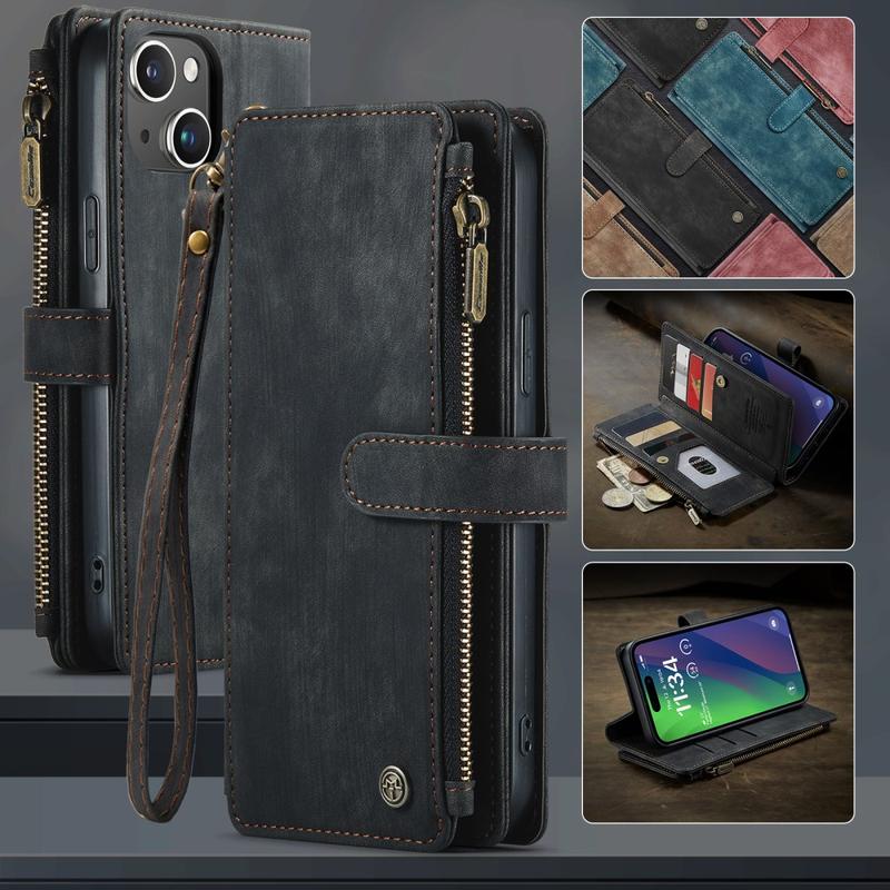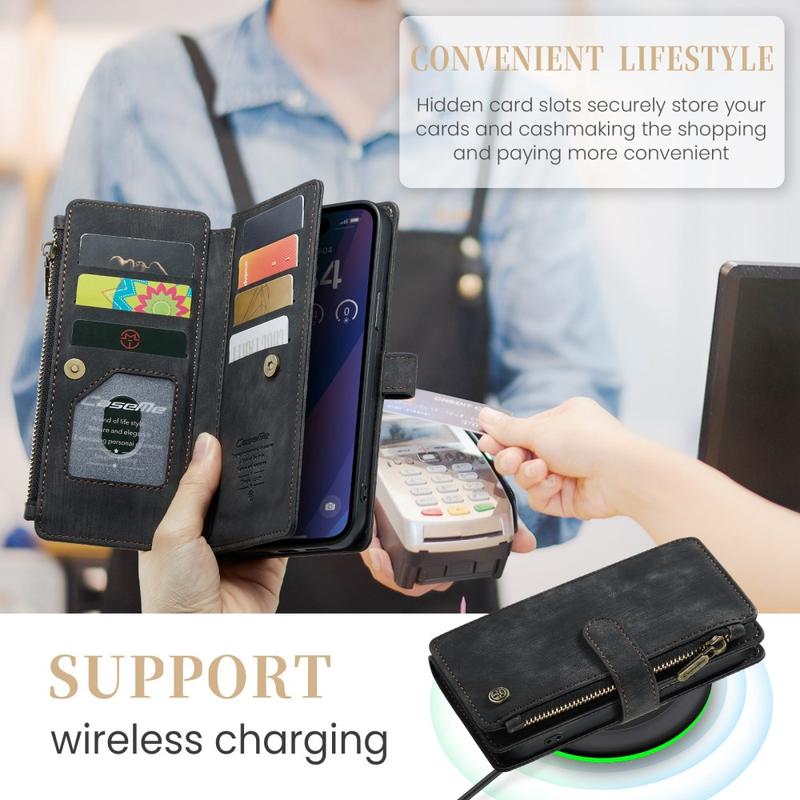 The Caseme C30 multifunctional wallet case for iPhone 16 Plus brings exceptional all-around protection and an exclusive, refined design. This elegant case is made of premium polyurethane, reinforced with a shock-resistant TPU inner cover that snuggles your iPhone 16 Plus perfectly. Meanwhile, the Caseme C30 wallet case is enhanced with numerous card slots, one large money compartment inside, and one outside zipper pocket, all protected by a secure magnetic closure.