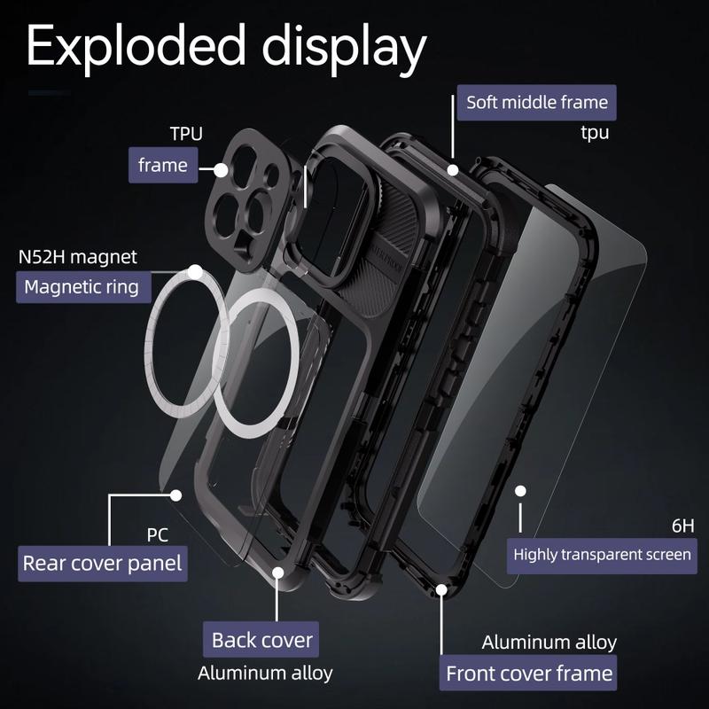 Protect your iPhone 16 Pro during underwater adventures with the Shellbox M Series IP68 Waterproof Case. Engineered for durability, this metal diving cover offers full-body protection up to 15 meters underwater, while maintaining MagSafe compatibility for seamless wireless charging. Its robust construction ensures your device remains secure in extreme conditions, making it ideal for divers, snorkelers, and outdoor enthusiasts.