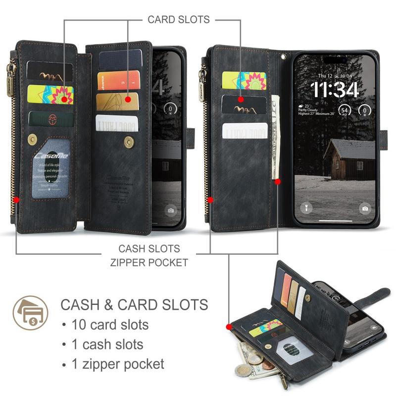 The Caseme C30 multifunctional wallet case for iPhone 17 Air brings exceptional all-around protection and an exclusive, refined design. This elegant case is made of premium polyurethane, reinforced with a shock-resistant TPU inner cover that snuggles your iPhone 17 Air perfectly. Meanwhile, the Caseme C30 wallet case is enhanced with numerous card slots, one large money compartment inside, and one outside zipper pocket, all protected by a secure magnetic closure.