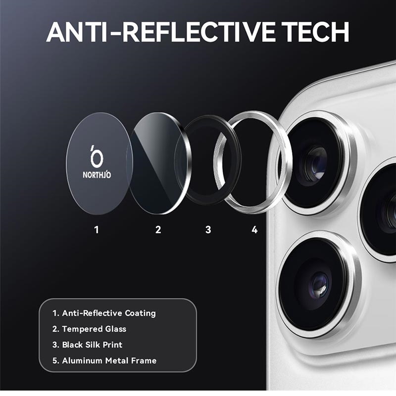 Upgrade your iPhone 17 Pro, iPhone 17 Pro Max with the Northjo camera lens protector. Featuring a CD veins aluminum ring, it adds a sleek, modern touch to your iPhone 17 Pro, iPhone 17 Pro Max while offering robust protection. The 9H tempered glass safeguards against scratches, impacts, and dust, ensuring your camera lens stays crystal clear. With easy, tool-free installation, you can enhance your iPhone 17 Pro, iPhone 17 Pro Max durability and aesthetics in seconds.