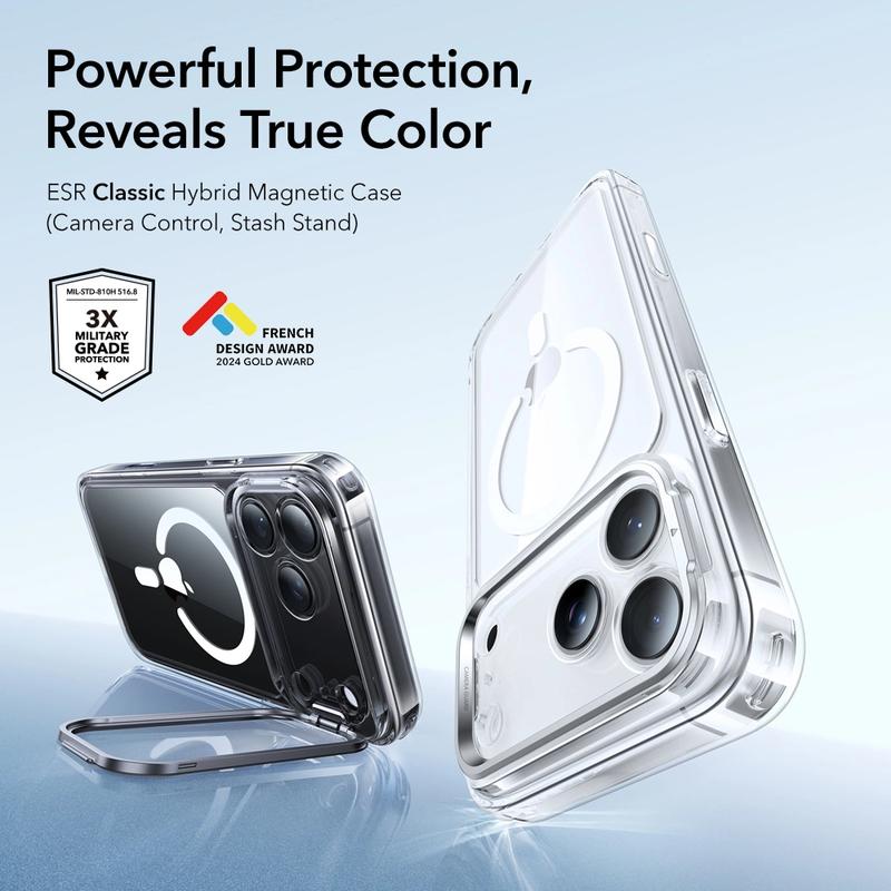 The ESR Classic Hybrid Kickstand Case for iPhone 17 Pro combines slim elegance with powerful protection. Its transparent hard back showcases your iPhone 17 Pro’s original design while reinforced TPU corners provide added durability against drops and impacts.