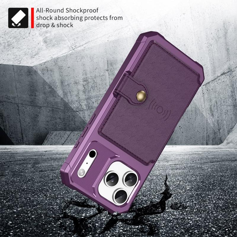 - iPhone 17 Pro wallet case has a secure snap button closure, wallet design, and several card slots with a cash pocket