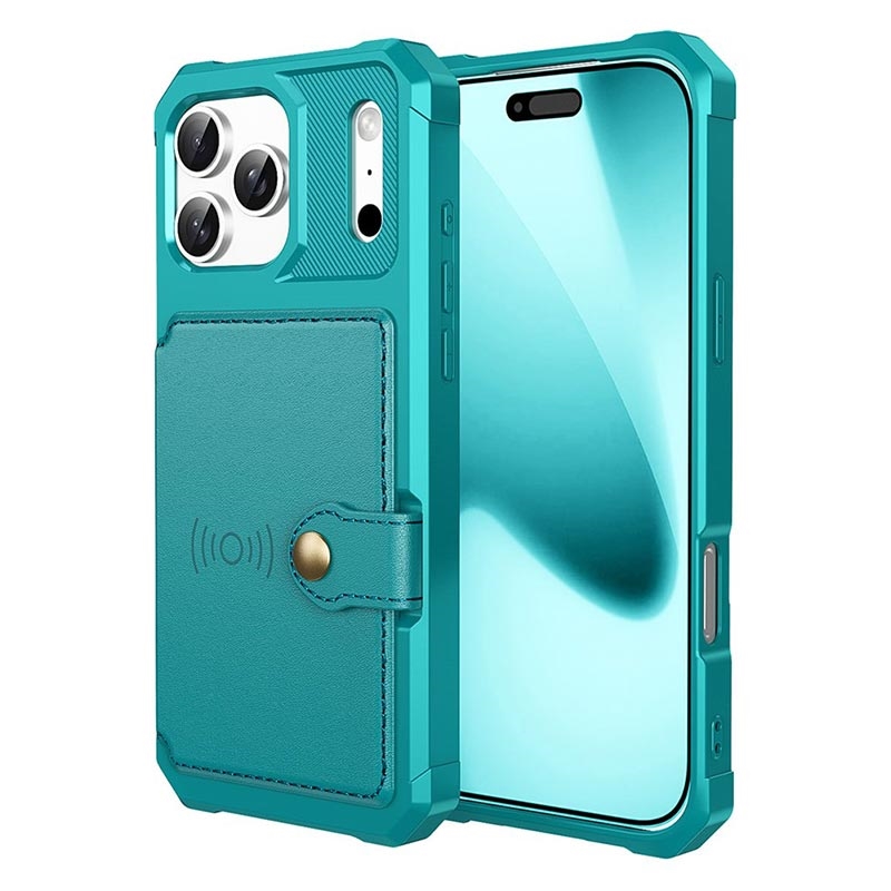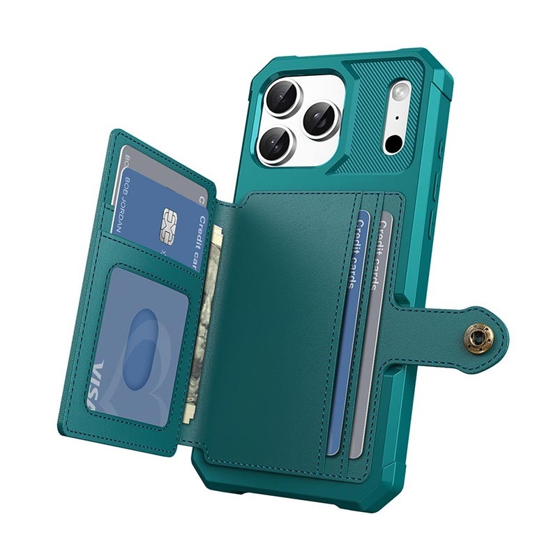 - iPhone 17 Pro Max wallet case has a secure snap button closure, wallet design, and several card slots with a cash pocket