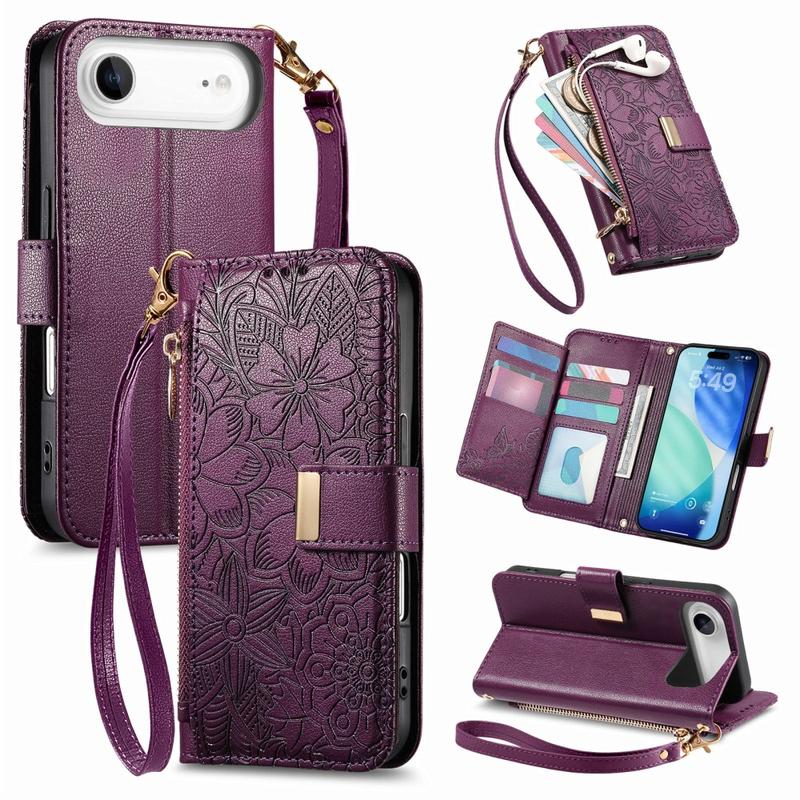 • Floral & Leaf Pattern Wallet Case with Zipper Pocket & Wrist Strap for iPhone Air