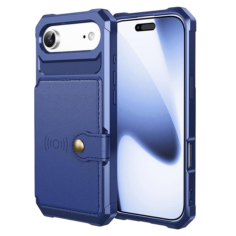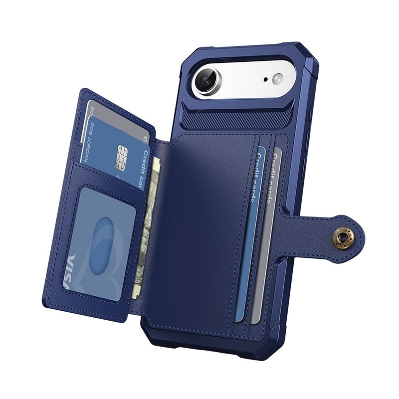 - iPhone Air wallet case has a secure snap button closure, wallet design, and several card slots with a cash pocket