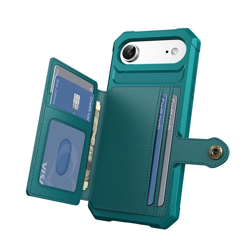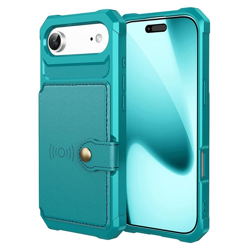 - iPhone Air wallet case has a secure snap button closure, wallet design, and several card slots with a cash pocket