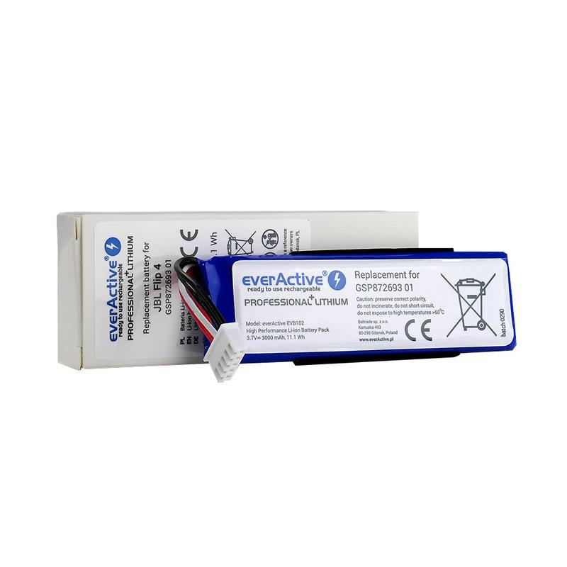 The EverActive EVB102 Lithium+ Professional Series Replacement Battery is a high-quality, original product designed as a direct replacement for the battery used in the popular JBL Flip 4 speaker. With a rated capacity of 3000mAh at 3.7V and an accumulated energy of 11.10 WH, this battery ensures uninterrupted, hours-long entertainment for you and your friends. The package consists of 3.7V li-ion cells connected in series, and the control electronics used make the EverActive EVB102 work exactly the same as batteries installed in factory devices. The durable cells enable more than 500 charging cycles, providing long-lasting performance. This battery is also certified with CE (including ROHS) and comes with the product code EVB102. It replaces batteries GSP872693 01 and GSP87269301.