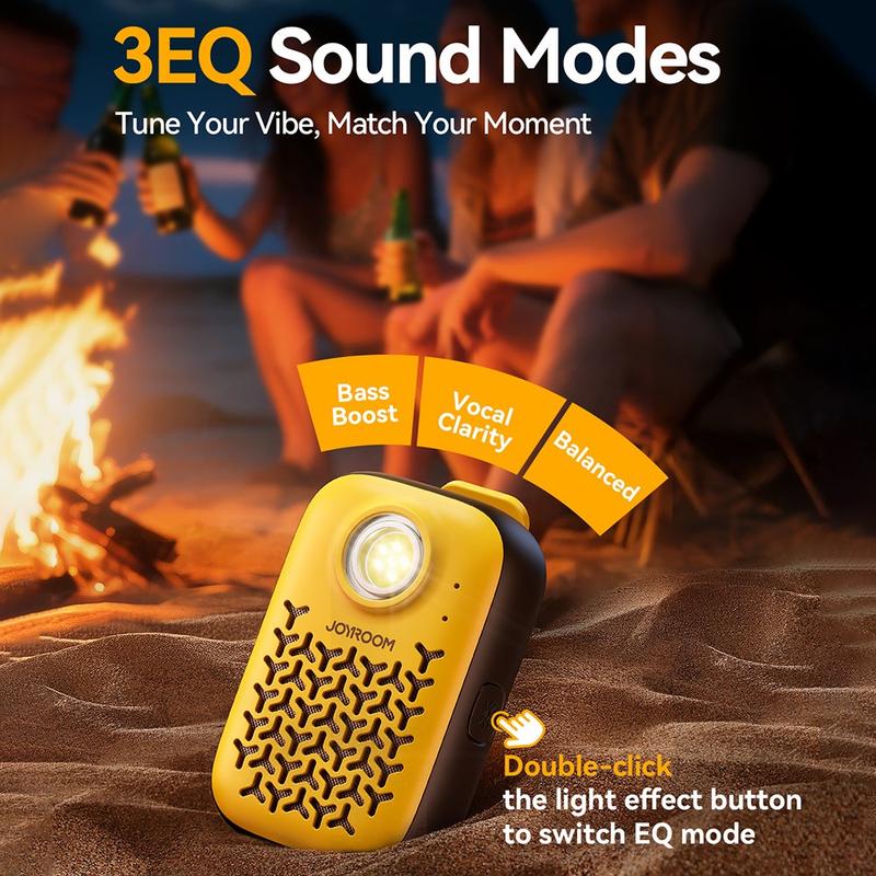 Take music, light and clear calls anywhere. The lightweight Joyroom JR-MS03 weighs just 86 g yet packs a 33 mm full-range driver, three switchable sound modes and an IP67 waterproof shell that laughs off rain, sand and full immersion. A high-strength clip and built-in magnet let you snap it to packs, handlebars or gym rigs, while the integrated LED lamp offers 50 %, 100 % and SOS flash for campsite chores or roadside emergencies. Bluetooth 5.4 keeps latency low, and ENC technology filters wind and crowd noise so calls stay crisp even on busy city streets.