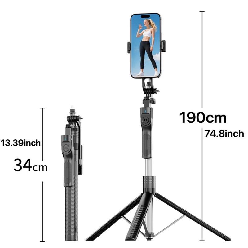 - Versatile 2-in-1 Design: Use as a selfie stick or tripod, extendable up to 190 cm for group shots, vlogs, and overhead recording.