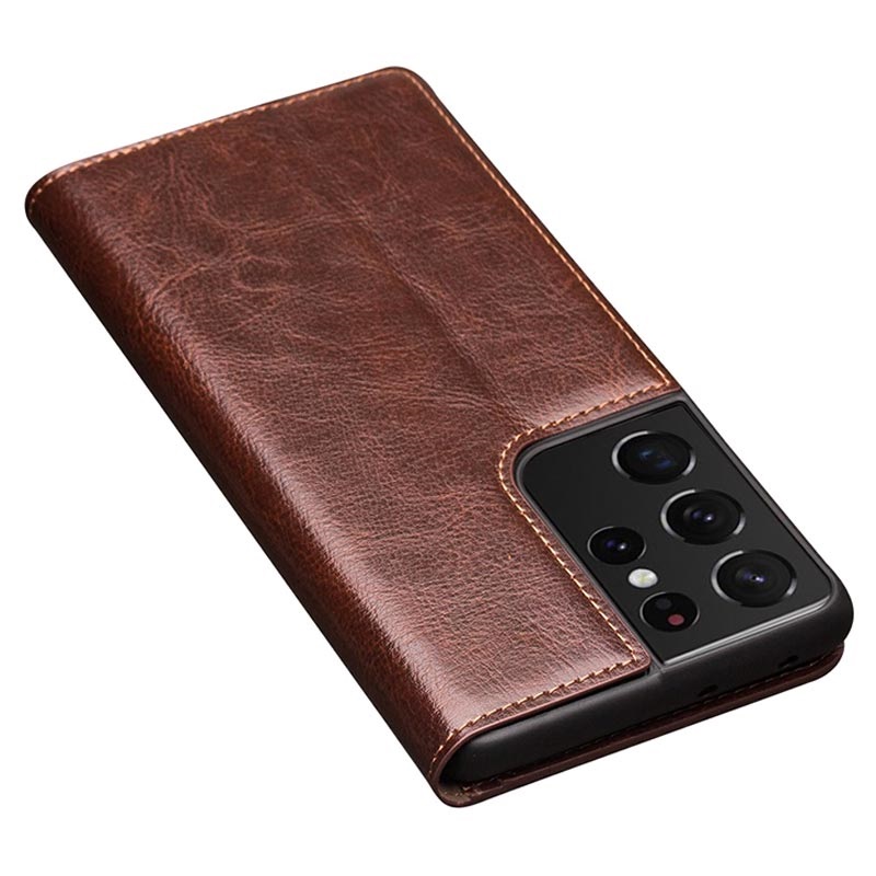 Vyrobeno z nejvyšší kvality hovězí kůry, Klasické pouzdro Qialino Classic Peněženka pro Samsung Galaxy S21 Ultra 5G dává vašemu zařízení stylový a elegantní vzhled, přičemž jej udržuje chráněné proti nežádoucímu každodennímu poškození. Případ peněženky má vnitřní kompartmenty pro ukládání vašich hotovosti a karet.
