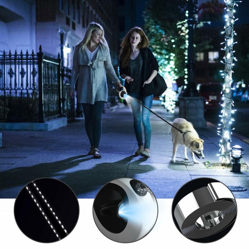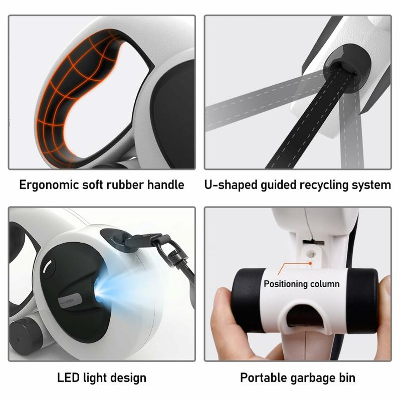 LED Retractable Dog Leash 5m - USB-Rechargeable Light, 360° Tangle-Free, Reflective Tape, Built-in waste-bag holder for Dogs up to 50kg