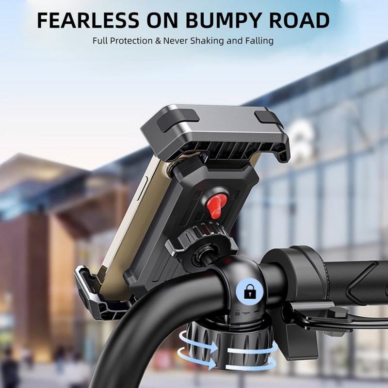 - Handlebar mount phone holder designed for motorcycles and similar rides