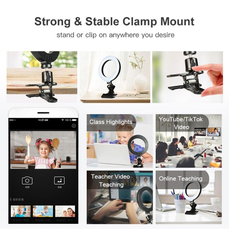 6" desktop ring light with 3 color modes and adjustable brightness levels. Comes with a strong clamp