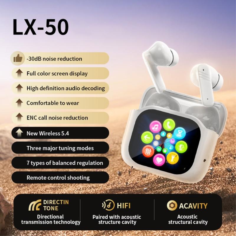 The LX-50 wireless earbuds combine smart control, effective noise reduction, and immersive sound in a modern in-ear design. The standout feature is the full-colour HD touch screen built into the charging case, letting you control settings, modes, and functions directly—no phone needed. With dual noise cancellation, stable Bluetooth 5.4 connectivity, and a comfortable ergonomic fit, the LX-50 earbuds are designed for everyday listening, calls, and on-the-go convenience.