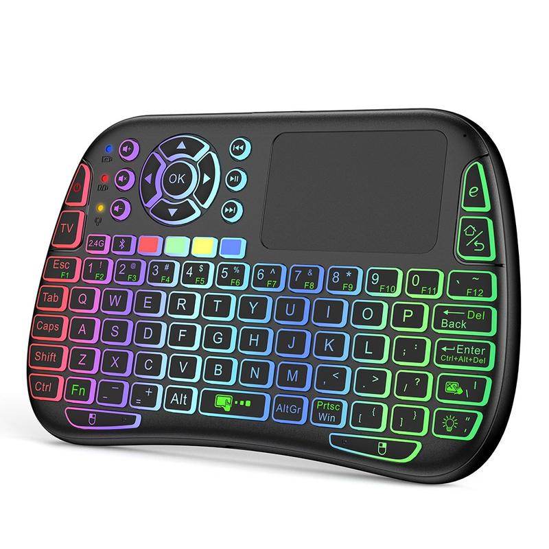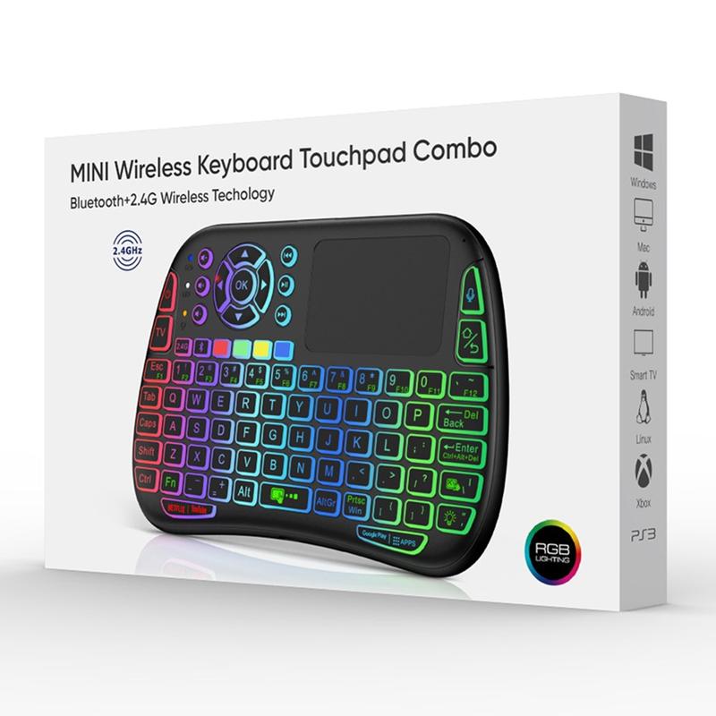 The keyboard supports both 2.4GHz wireless connection via USB receiver and Bluetooth-compatible 5.0, giving you flexibility across many devices including Smart TVs, HTPC systems, laptops, tablets, and Android devices. The built-in touchpad with multi-touch gestures replaces a mouse, while the colorful RGB backlight makes it easy to use even in dark rooms.