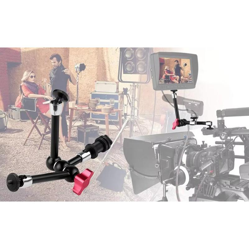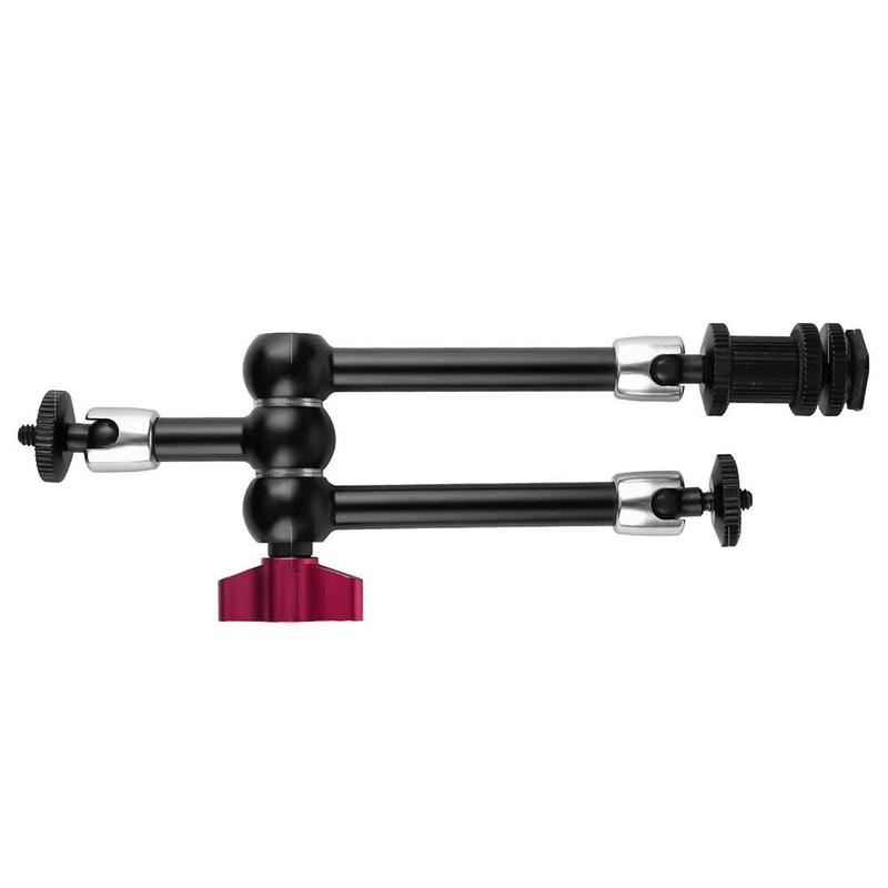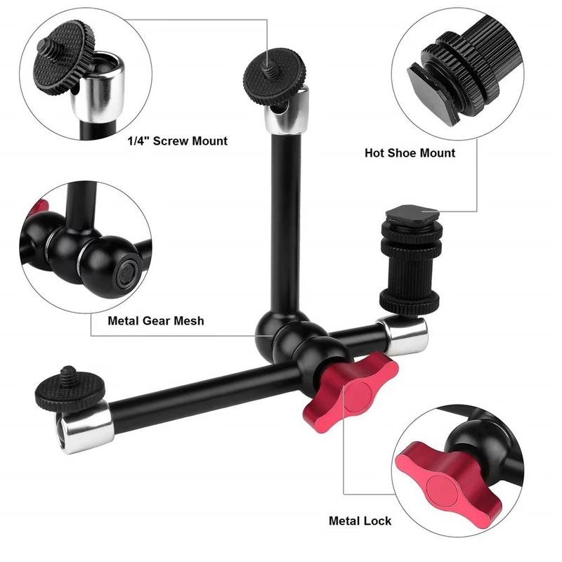 Made from aluminum alloy and stainless steel, the mount offers a strong and durable structure with a metal gear mesh design for more secure positioning. The 360 adjustment on all joints makes it easier to fine-tune angles, while the hot shoe and 1/4" mounting support gives it broad compatibility with DSLR cameras and related accessories. Red quick-lock handles allow fast setup and repositioning without tools, helping streamline your workflow during shooting.