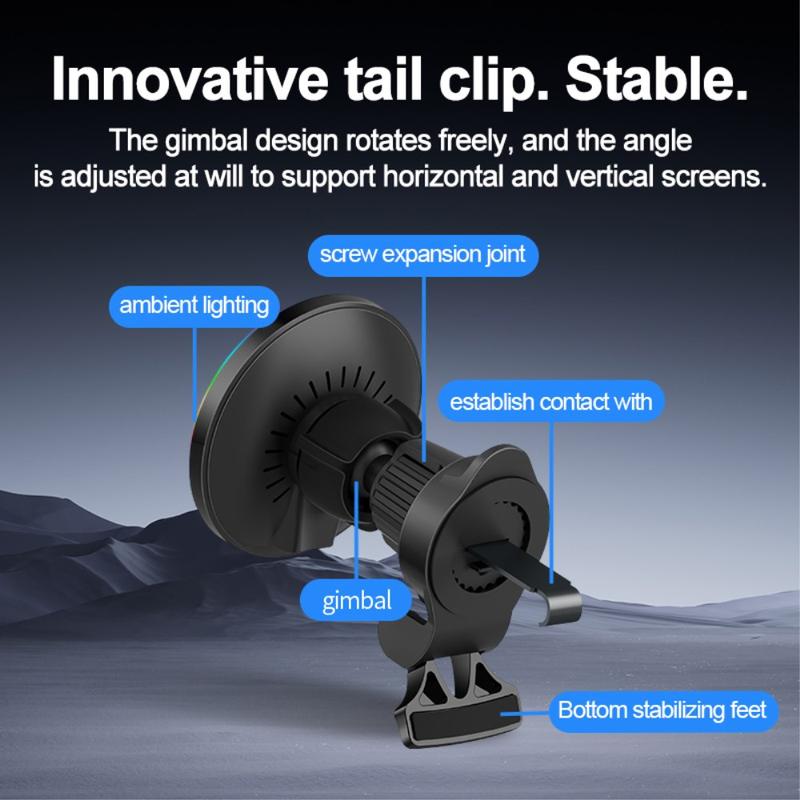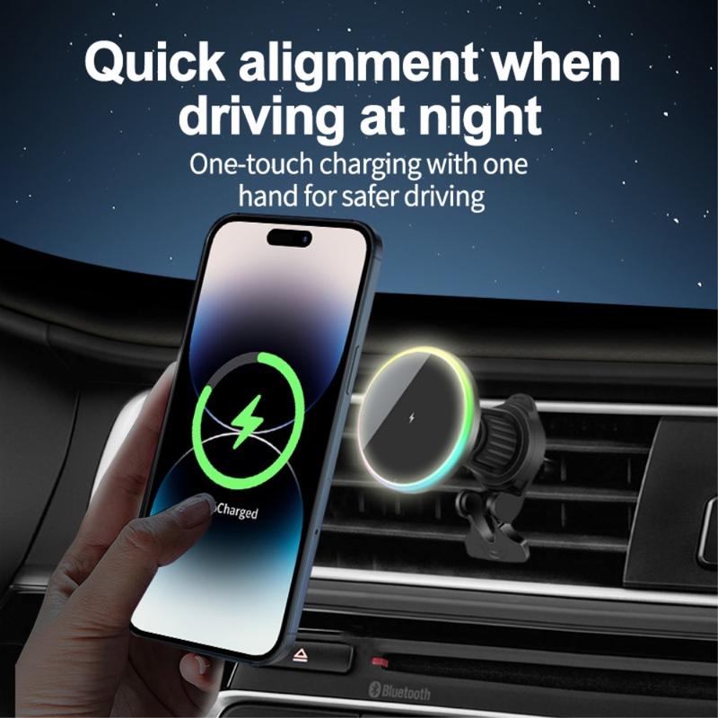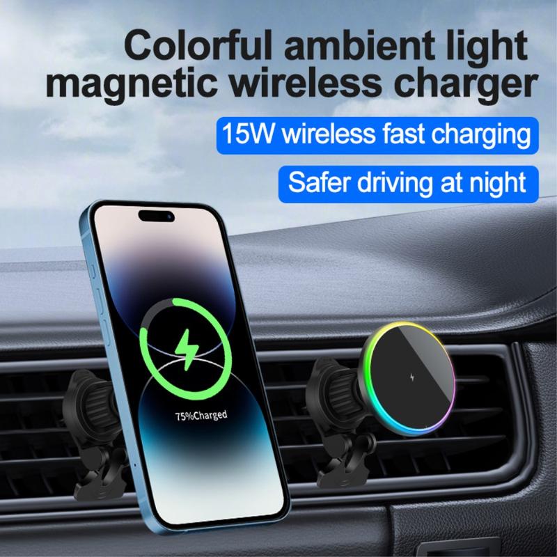 The OJD-121 Magnetic Wireless Charger for iPhone is designed to provide seamless charging and secure mounting in your car. Featuring strong magnetic attraction, it ensures your phone stays in place while charging and navigating. The charger supports up to 15W fast wireless charging and includes ambient lighting for nighttime convenience. Its compact size prevents it from blocking the car air vent, and it supports all Qi-standard devices with magnetic adsorption.