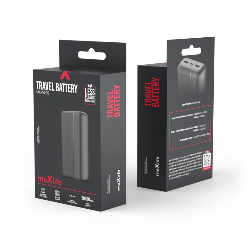The MXPB-02 from Maxlife is a powerful and versatile powerbank with a capacity of 30,000 mAh, allowing for long-lasting charging with 12W power. Its two USB ports make it convenient to charge two devices simultaneously. The powerbank also features diodes that inform users about the remaining energy in the battery, and is easily rechargeable with both USB-C and microUSB inputs. Its minimalist design, with a timeless black matte finish and aesthetic panel with a rough surface, gives it a sleek and modern look. Additionally, the MXPB-02 series is sold in plastic-free boxes, making it an environmentally-friendly choice.