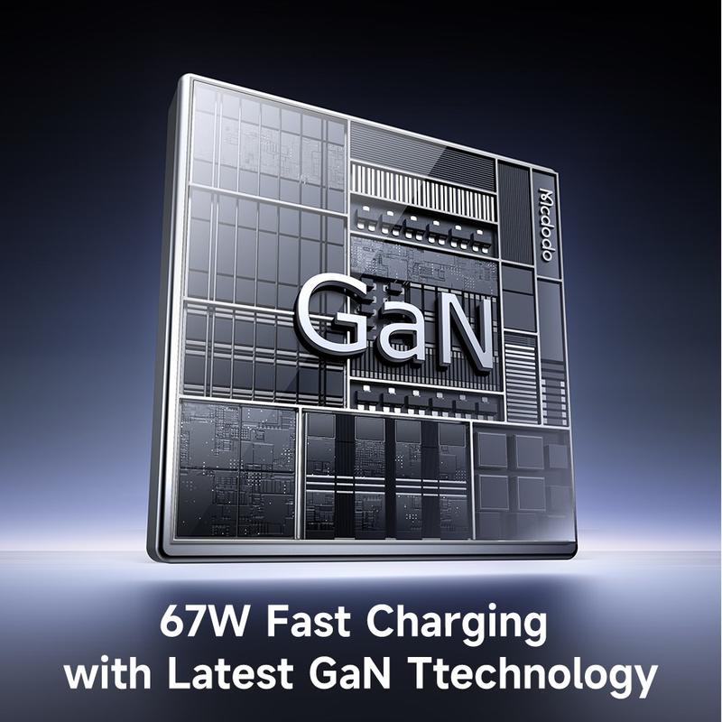 - GaN architecture delivers up to 67W while running cooler and smaller than traditional silicon bricks.