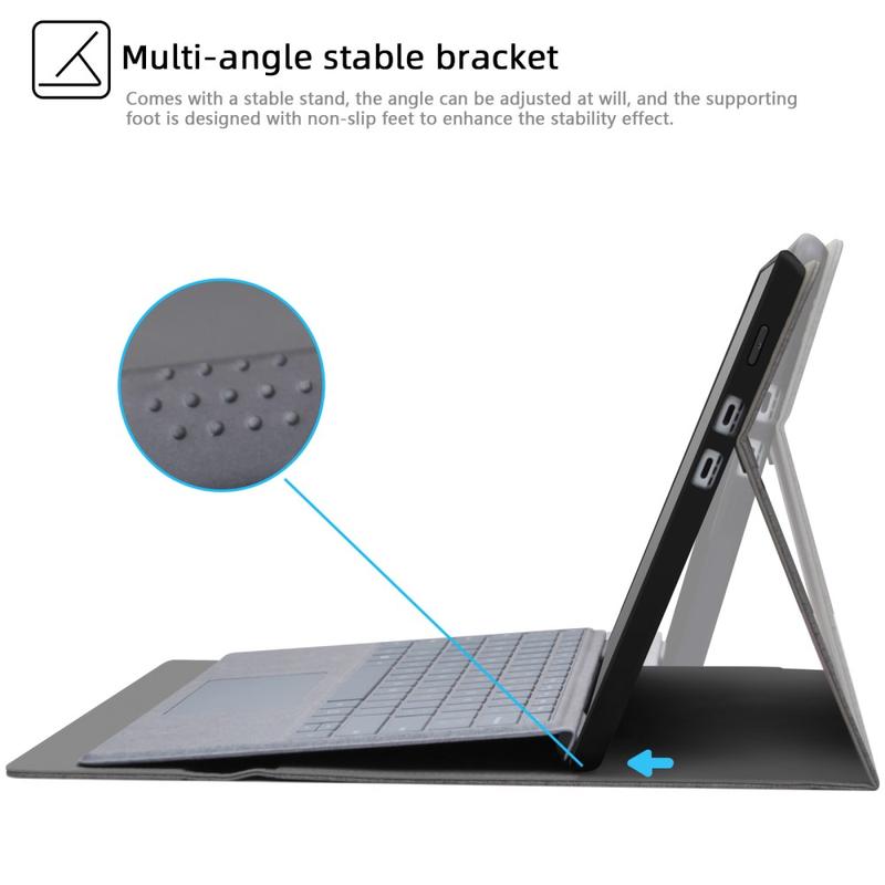 The integrated stand supports multiple viewing angles, allowing comfortable positioning for typing, browsing, reading or watching videos. Anti-slip foot details ensure the stand remains stable on desks, tables and other flat surfaces.