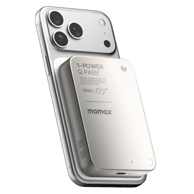 • Momax 1-Power Q.Pass2 Qi2.2 25W Banque d'alimentation sans fil magnétique 10000mAh - USB-C PD 30W, Snap-On Charging for iPhone 12-17 Series