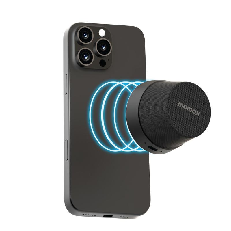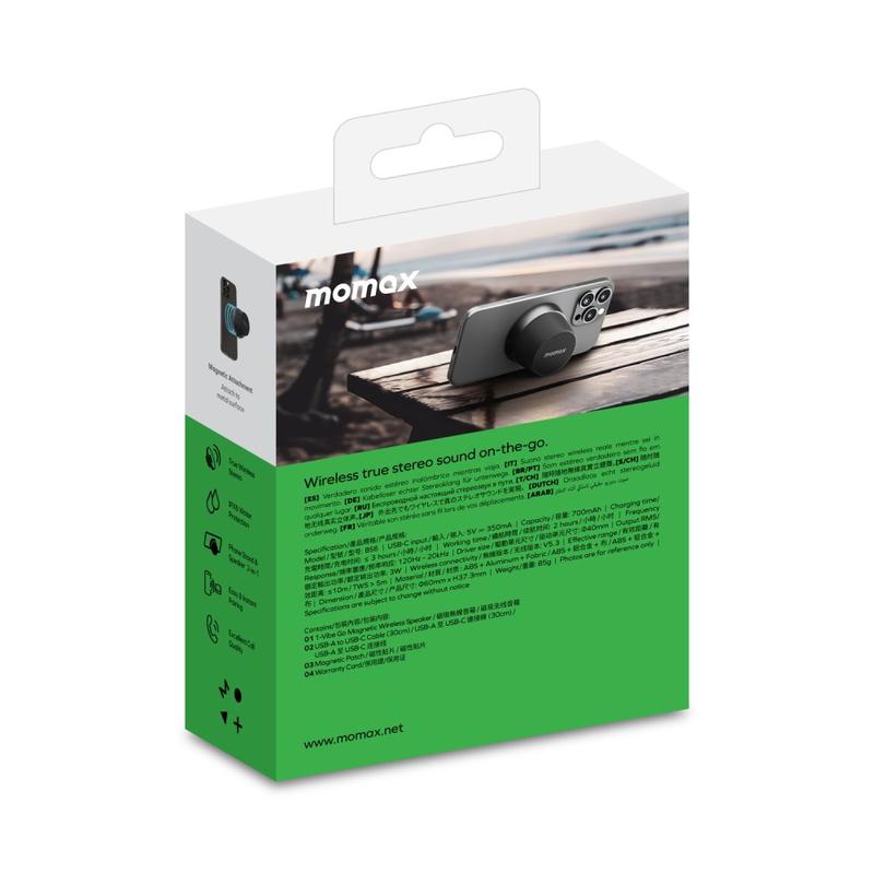 The MOMAX 1-Vibe Go BS6 magnetic mini Bluetooth speaker is a compact, versatile audio solution designed for everyday entertainment at home or on the go. Its ultra-mini magnetic design combines a portable wireless speaker with a practical phone stand, letting you enjoy music, videos, and calls with ease. Equipped with a powerful 40 mm driver and 360° sound output, it delivers immersive audio in a surprisingly small form, while IPX6 water resistance makes it suitable for daily use in different environments.