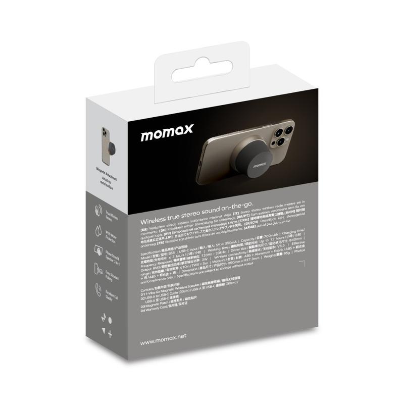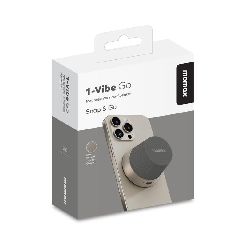 The MOMAX 1-Vibe Go BS6 magnetic mini Bluetooth speaker is a compact, versatile audio solution designed for everyday entertainment at home or on the go. Its ultra-mini magnetic design combines a portable wireless speaker with a practical phone stand, letting you enjoy music, videos, and calls with ease. Equipped with a powerful 40 mm driver and 360° sound output, it delivers immersive audio in a surprisingly small form, while IPX6 water resistance makes it suitable for daily use in different environments.