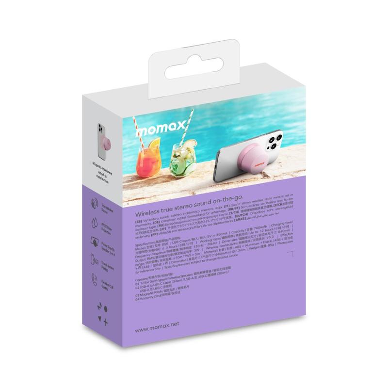 The MOMAX 1-Vibe Go BS6 magnetic mini Bluetooth speaker is a compact, versatile audio solution designed for everyday entertainment at home or on the go. Its ultra-mini magnetic design combines a portable wireless speaker with a practical phone stand, letting you enjoy music, videos, and calls with ease. Equipped with a powerful 40 mm driver and 360° sound output, it delivers immersive audio in a surprisingly small form, while IPX6 water resistance makes it suitable for daily use in different environments.