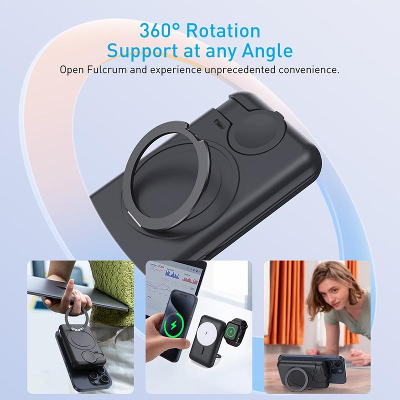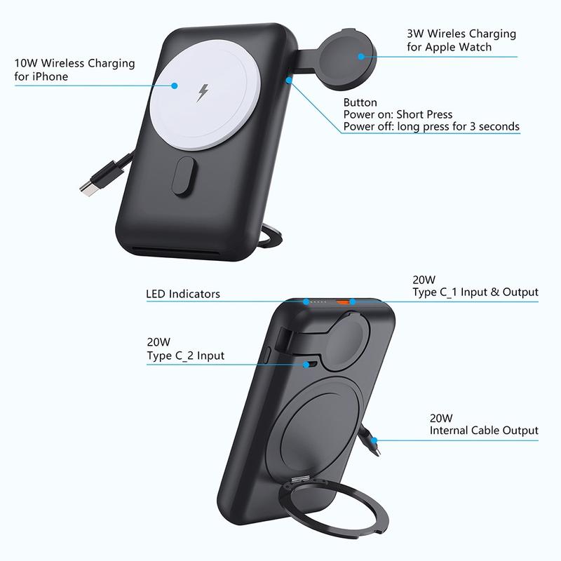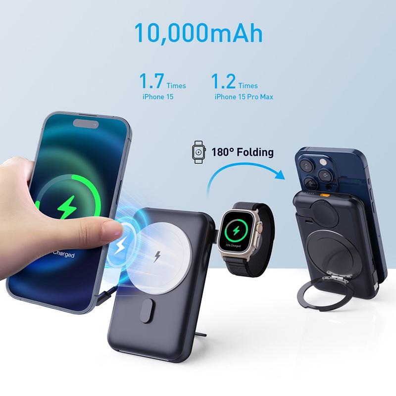 MP07 10000mAh 3-in-1 Magnetic Power Bank - MagSafe Compatible, Wireless Charger with Built-In Cable and Rotating Stand for iPhone, AirPods and Apple Watch