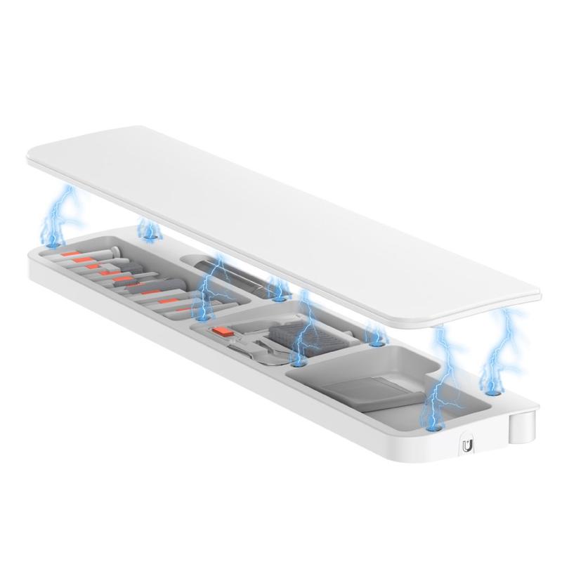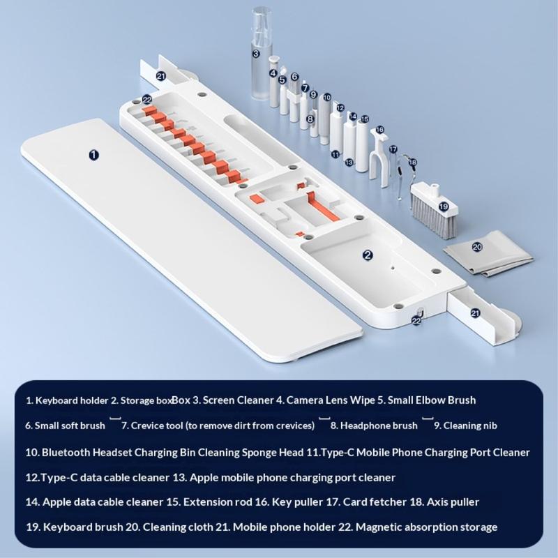 Inside the wrist rest is a complete 22-tool cleaning kit designed for deep cleaning of keyboards, earphones, phone charging ports, camera lenses, switches and other electronic devices. Each tool has its own place, ensuring easy organisation and fast access.