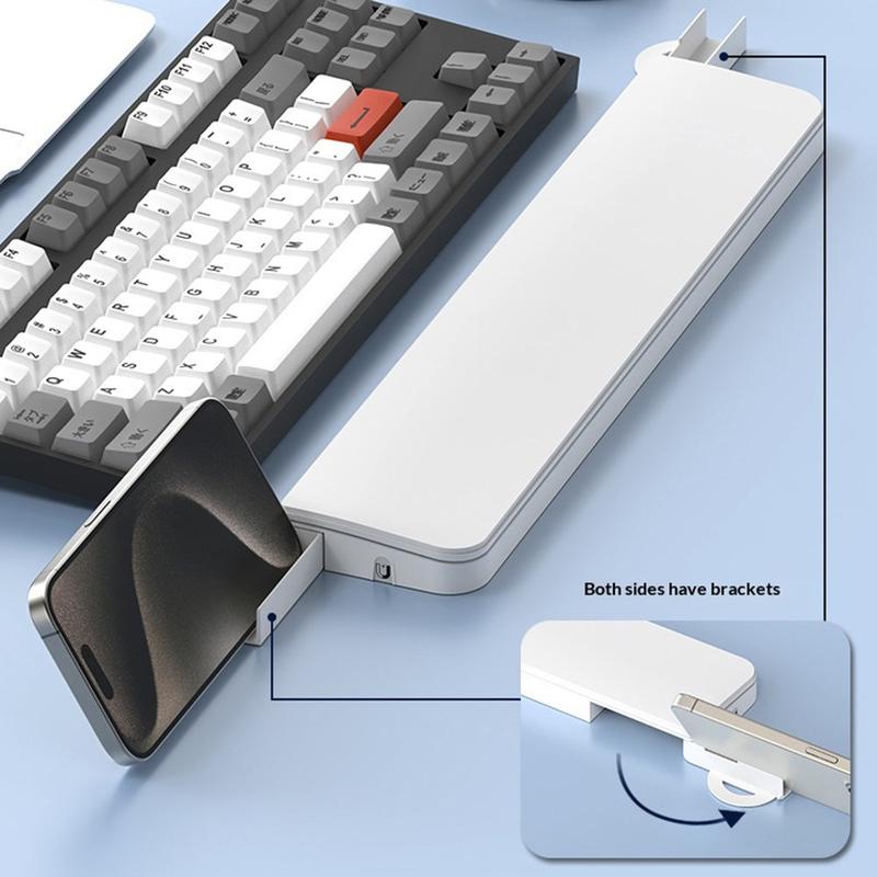 A built-in phone stand on the side of the wrist rest allows you to place your phone upright for viewing messages, watching videos or taking short breaks while working or gaming.