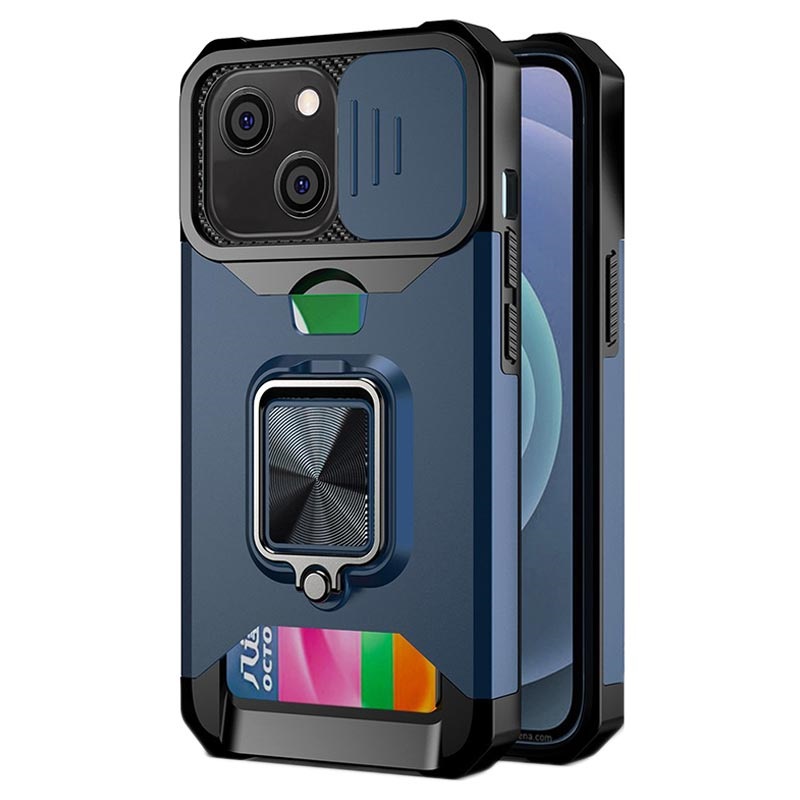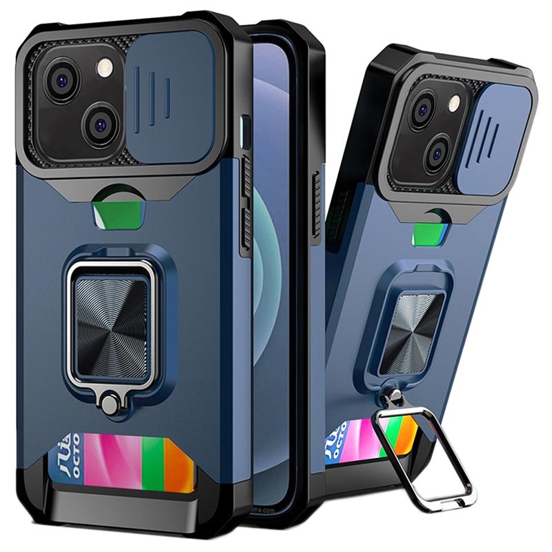 Multifunkční hybridní pouzdro 4-in-1 pro iPhone 13 s držákem karty, magnetickým prstenem, stonkem, ochranou fotoaparátu