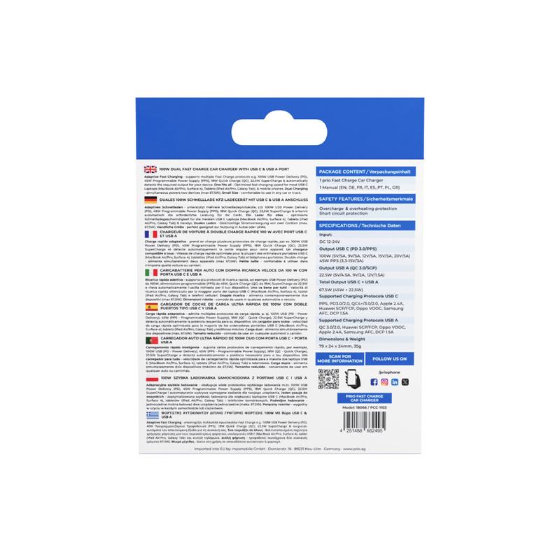 Nabíječka do auta Prio Fast Charge se 100W PD USB-C, 22,5W USB-A