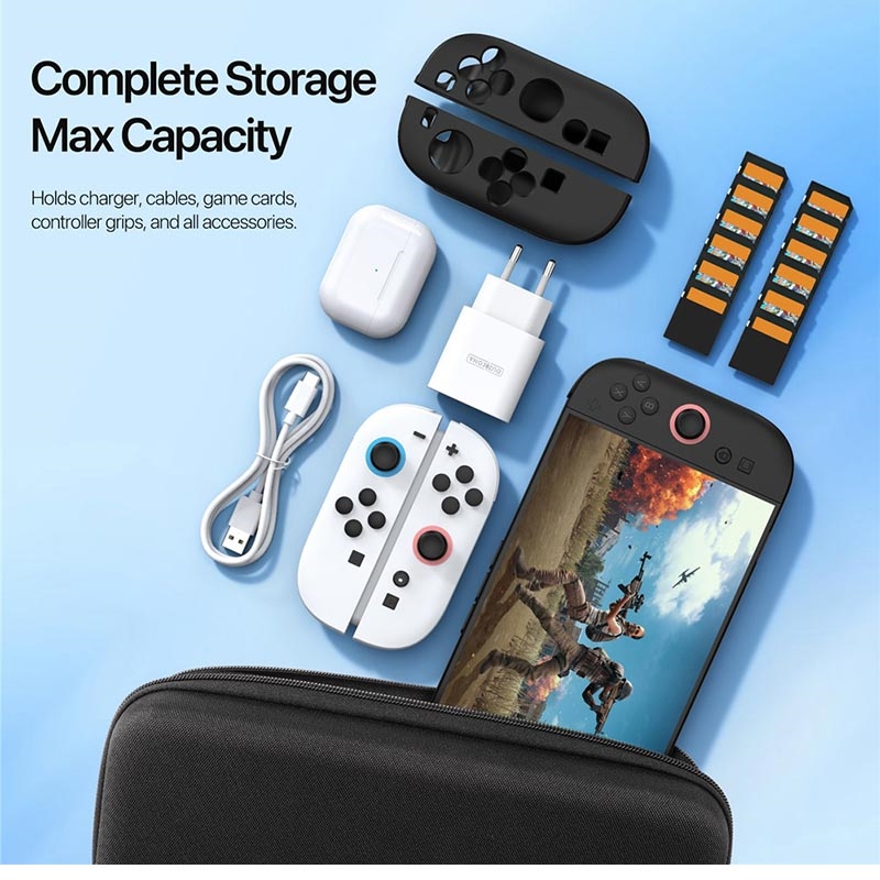 - Ample interior space for chargers, data cables and Joy-Con grips, keeping everything tidy in one place