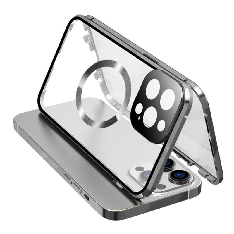 Oboustranné pouzdro s tvrzeným sklem a magnetickým kovovým rámečkem proti pádu pro iPhone 15 kompatibilní s krytem telefonu MagSafe se zámkem na přezku - stříbrné