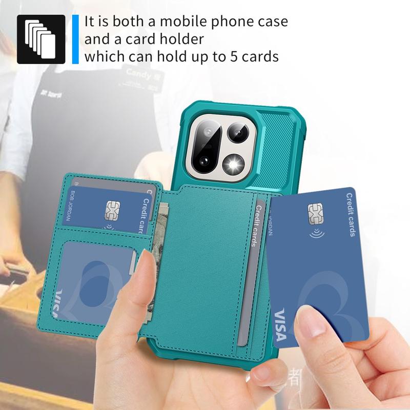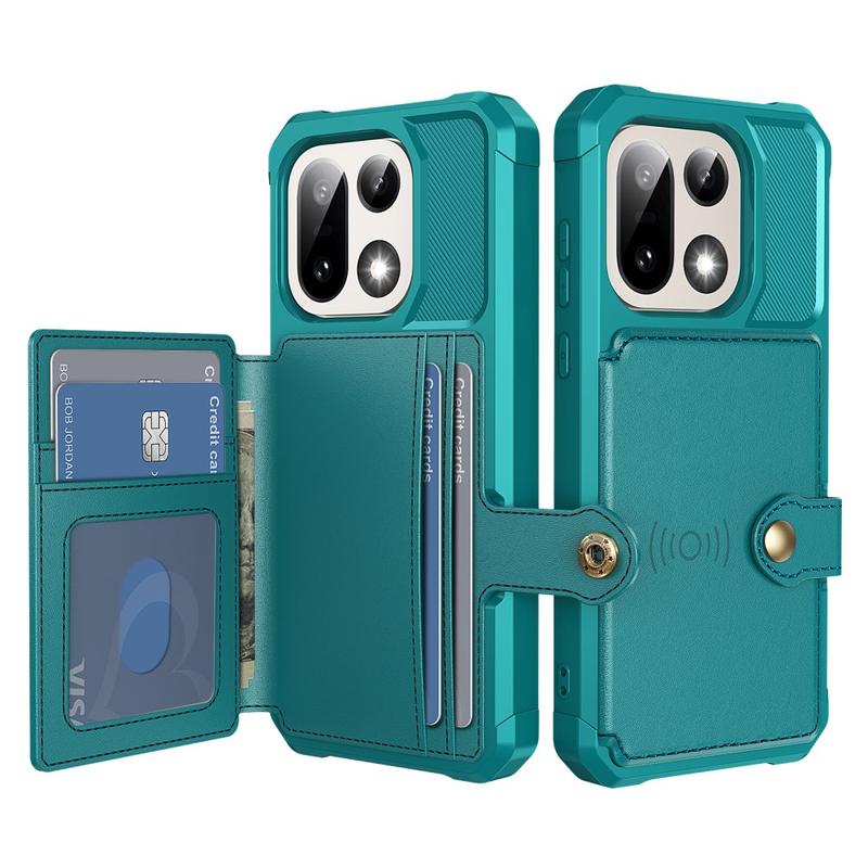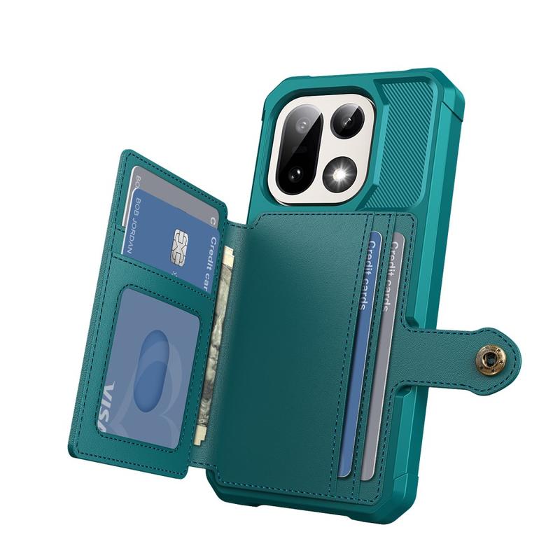 - OnePlus 15 wallet case has a secure snap button closure, wallet design, and several card slots with a cash pocket