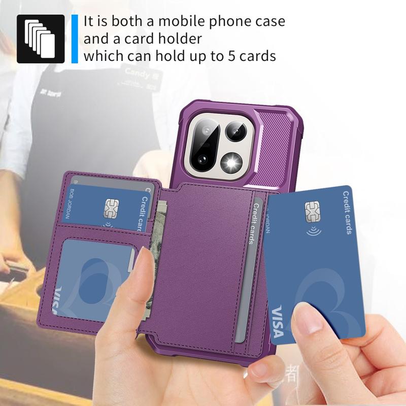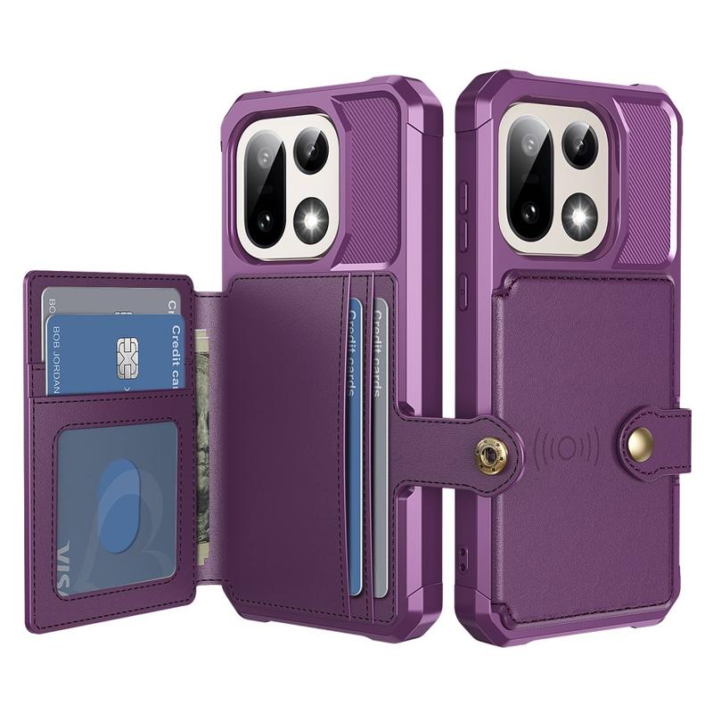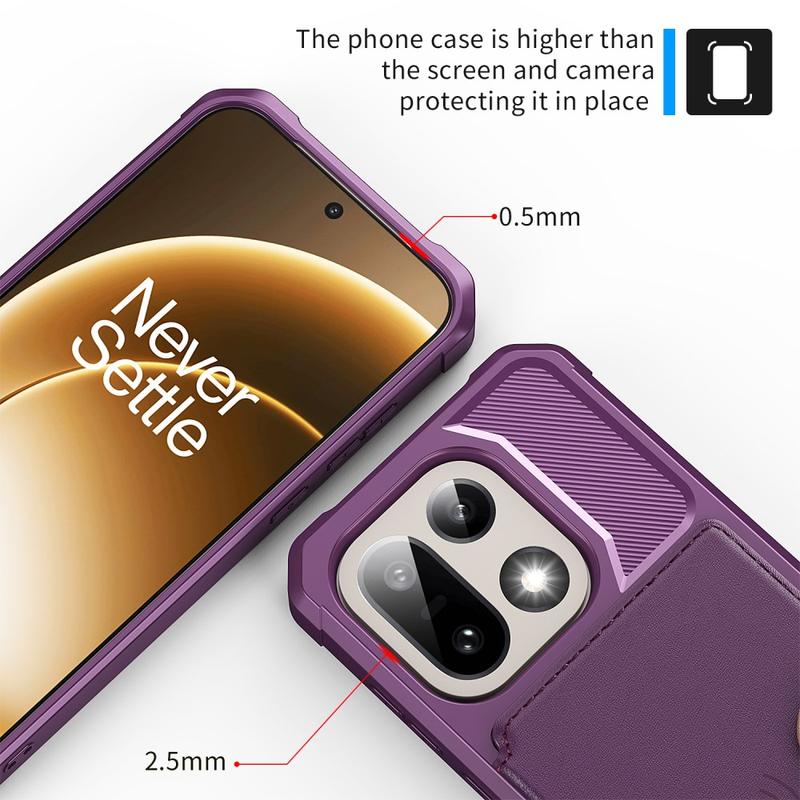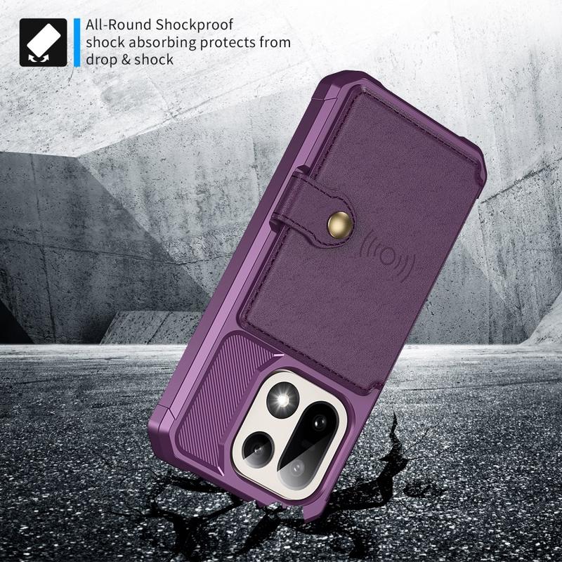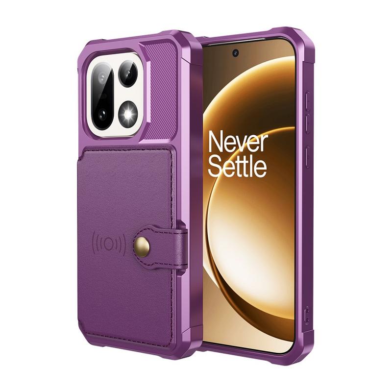 - OnePlus 15 wallet case has a secure snap button closure, wallet design, and several card slots with a cash pocket