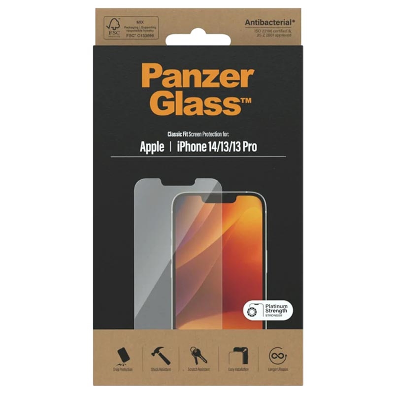 PanzerGlass Classic Fit AntiBacterial Tempered Glass Screen Protector for iPhone 13, iPhone 13 Pro, iPhone 14