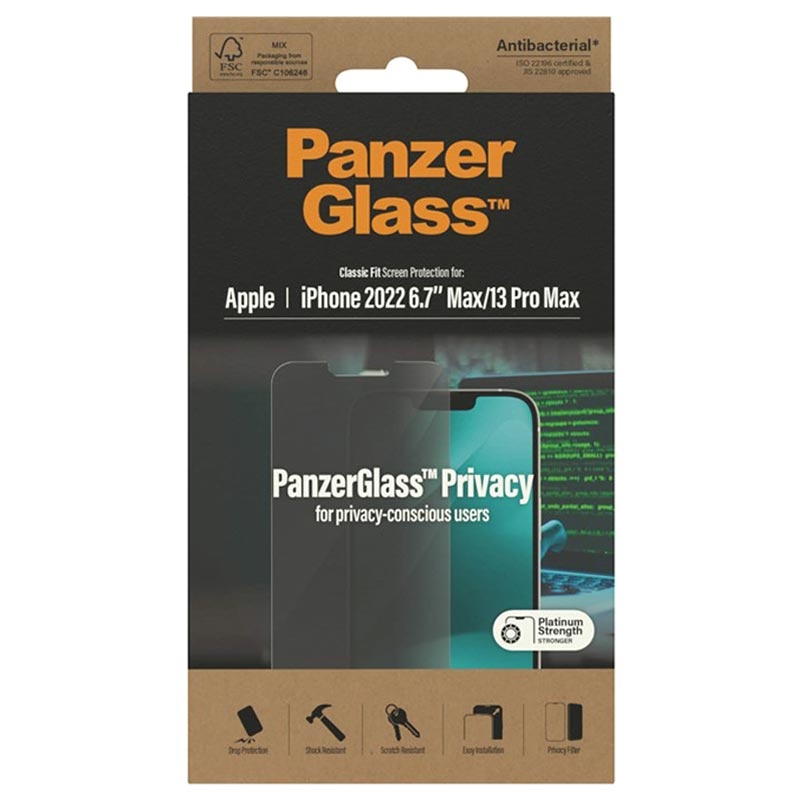 PanzerGlass Classic Fit Privacy AntiBacterial Tempered Glass Screen Protector for iPhone 13 Pro Max, iPhone 14 Plus