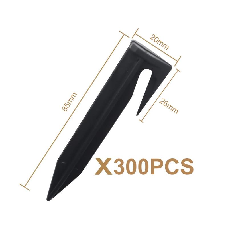 Secure your garden installations with this comprehensive set of 300 plastic ground staples. Measuring 8.5 cm each, these durable stakes are ideal for anchoring lawn mower boundary wires, garden edging, and various landscaping materials, ensuring a neat and orderly outdoor space.